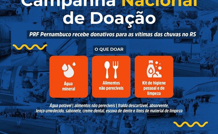 A Polícia Rodoviária Federal (PRF) em Pernambuco segue até o próximo dia 21 de maio com a campanha de arrecadação de donativos para as vítimas das enchentes no Rio Grande do Sul (RS). As doações estão chegando em todas as unidades da PRF no estado e você também pode ajudar. O que doar? Os interessados em ajudar as centenas de pessoas desabrigadas e desalojadas no RS podem doar água mineral, alimentos não perecíveis, produtos de LER NOTÍCIA