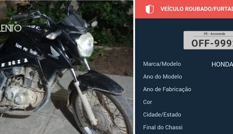 O efetivo militar de Águas Belas apreendeu uma motocicleta na noite de quinta-feira, dia 18, devido a apresentar sinais de adulteração na numeração do motor. Durante rondas, os policiais avistaram o ocupante da motocicleta sem capacete. Ao realizar a consulta veicular, constatou-se que a placa condizia com a numeração do chassi, porém o motor apresentava sinais claros de adulteração nos últimos seis dígitos, possivelmente raspados e remarcados. O proprietário não apresentou documentação do veículo e LER NOTÍCIA