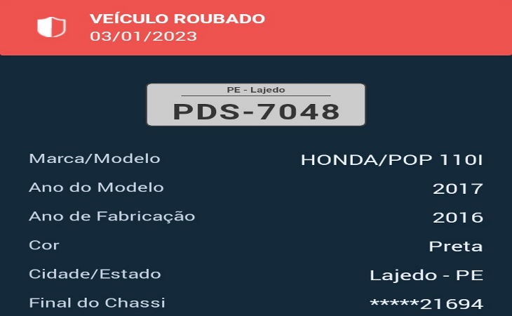 Três marginais praticaram o roubo numa moto Um homem teve sua motocicleta roubada quando trafegava pela BR-423 na área rural do município de Jupi/PE. O assalto foi praticado por três elementos que estavam em outra moto e ocorreu por volta das 5h de quarta-feira, 3. A moto tem placa RZE-7D95 e modelo Pop 110I. O cidadão guiava o veículo pela rodovia quando se deparou com uma moto com três indivíduos, um deles estava armado com LER NOTÍCIA
