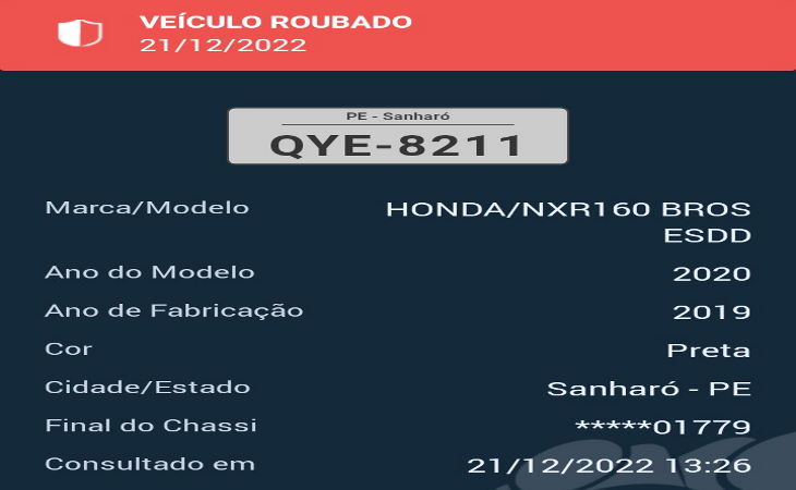 Policiais militares do 15º BPM aprenderam uma motocicleta modelo Biz, branca, com placa PCD-0705, que estava com queixa de roubo. A apreensão ocorreu no Alto Santiago, em São Bento do Una nesta terça-feira, 25. O efetivo do GATI realizava rondas pelo local quando consultou a placa da moto sendo encontrada uma restrição de roubo/furto. Uma mulher de 43 anos que estava de posse do veículo informou os policiais que havia adquirido a motocicleta através da LER NOTÍCIA