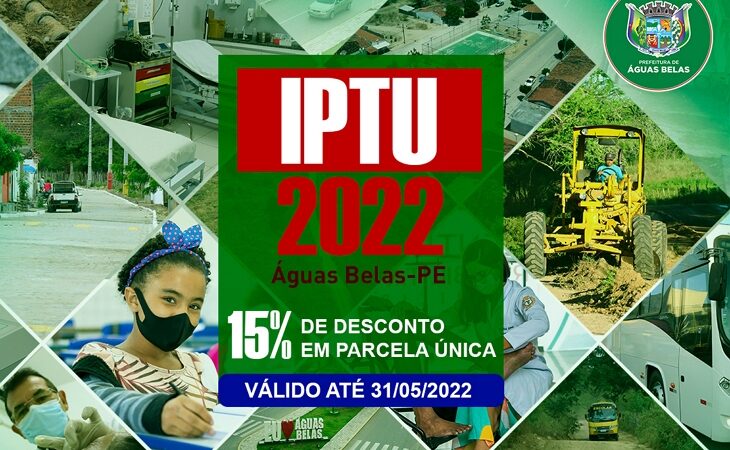 A Prefeitura de Águas Belas, por meio do Setor de Tributos, informa que o prazo para pagamento do IPTU 2022 se vence no dia 31 desse mês. Pagando até o vencimento, você garante 15% de desconto no valor do boleto. Ao lado do Alvará, o IPTU é a principal fonte de receita própria do município. Sua arrecadação impulsiona a realização de obras e manutenção dos serviços que chegam à população na cidade, distritos e zona LER NOTÍCIA