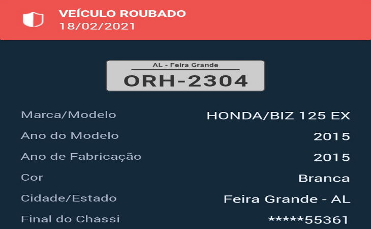 Policiais militares da cidade de Águas Belas apreenderam uma motocicleta modelo Biz, 125 ES, placa original OYP-8647. A apreensão ocorreu na sexta-feira, 1, durante uma abordagem. Conforme os militares, a viatura realizava rondas com abordagens quando visualizou dois indivíduos em atitude suspeita pilotando uma motocicleta. Abordados, nada de ilícito foi encontrado em suas posses. Porém, ao realizar a consulta veicular foi constatado que a moto apresentava indícios de adulteração no chassi e motor, contendo restrição LER NOTÍCIA