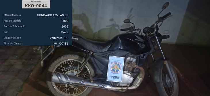Duas motos com as numerações dos chassis adulterados, foram apreendidas neste domingo (5), no município de Canhotinho, no Agreste de Pernambuco. Na Rua Santo Antônio, foi apreendida uma moo Honda, CG, cor preta, que estava sendo conduzida por Maykon Jean, de 30 anos. No bairro Elisa Holanda, foi apreendida a Motocicleta Honda CG, também na cor preta, que estava com José Edilúcio, de 37 anos. Os homens foram conduzidos para delegacia, as motos apreendidas e LER NOTÍCIA
