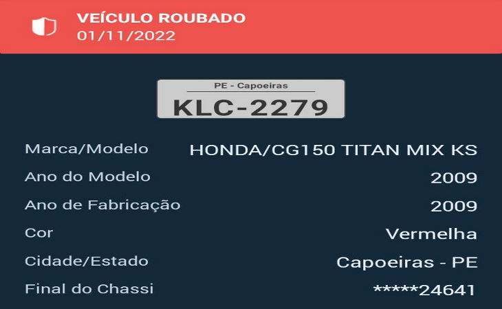 A própria vítima conseguiu recuperar o veículo Uma motocicleta modelo Pop de cor vermelha que havia sido furtada no domingo, 30, na Rua Ione Tenório Monteiro, Cohab II, em Garanhuns, foi encontrada abandonada na mesma localidade. A vítima acionou a polícia e relatou que havia deixado a motocicleta estacionada na porta da residência, após algumas horas percebeu que ela tinha sido furtada. Diante do ocorrido a própria vítima passou a realizar buscas ao veículo e LER NOTÍCIA