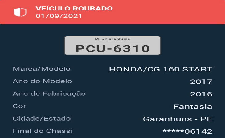 Foi furtada uma motocicleta que estava estacionada na frente de um condomínio, às margens da BR-424, ao lado do viaduto do Magano, em Garanhuns, durante à tarde de terça-feira, 30. O proprietário da moto Bros branca de placa OYU-1833 contou a polícia que foi trabalhar no condomínio, mas foi orientado pela segurança a deixar a moto do lado de fora, com isso, horas depois percebeu que a moto não estava mais no local onde havia LER NOTÍCIA