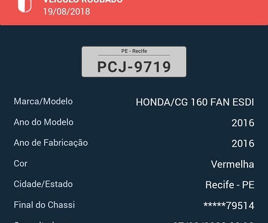 Piloto disse aos policiais que havia adquirido o veículo numa troca. Nesta terça-feira, 6, a Polícia Militar apreendeu uma motocicleta CG 160 Fan de cor vermelha com placa PCJ-9719 que estava com queixa de roubo. A apreensão ocorreu na cidade de Joaquim Nabuco por militares do 10º BPM. Conforme os militares, o condutor da motocicleta foi abordado por uma equipe policial que ao realizar consulta referente a numeração do chassi foi constatado que ela possuía LER NOTÍCIA