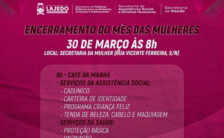 E o mês da mulher não acabou! Vai ter encerramento especial sim! Ainda em comemoração à representatividade da data 8 de março – Dia Internacional da Mulher, a Prefeitura de Lajedo preparou um momento para fechar o mês com chave de ouro! Teremos serviços da Saúde, da Assistência Social e da Secretaria da Mulher, pioneira nesta ação! Porque lugar de mulher é onde ela quiser!