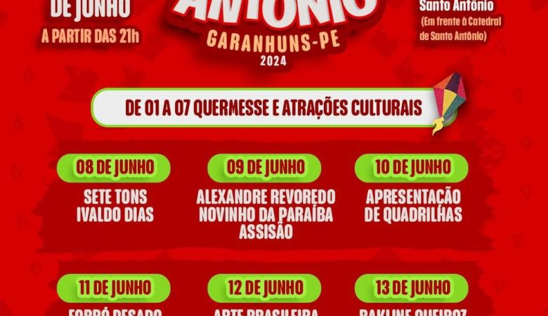 Eventos vão contar com apresentações musicais, de quadrilhas e celebrações religiosas Dando continuidade às atividades do Ciclo Junino em Garanhuns, o município promove a Festa de Santo Antônio, de 01 a 13 de junho, e a Festa de São Pedro, nos dias 28 e 29 de junho. Os eventos são realizados pela Prefeitura de Garanhuns, por meio da Secretaria de Cultura, e pela Paróquia de Santo Antônio. A programação conta com shows, apresentações de quadrilhas LER NOTÍCIA