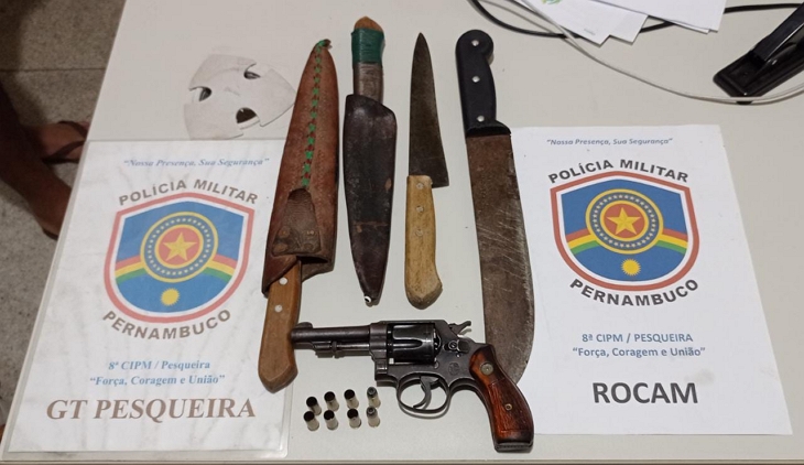 Um homem foi preso pela Polícia Militar na tarde desta sexta-feira (24), no município de Pesqueira, no Agreste de Pernambuco. A PM recebeu denúncia que ele estava armado com um revólver e efetuando disparos em uma rua, viaturas foram deslocadas para atender a ocorrência e o elemento correu pra dentro de casa onde tentou esconder um revólver calibre 32 que estava com seis munições deflagradas. Além do revólver, dentro da residência foram encontradas facas e LER NOTÍCIA