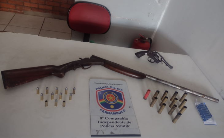 Suspeito foi preso em casa com as armas embaixo do sofá. Policiais da 8ª CIPM apreenderam um revólver cal. 38, uma espingarda cal. 28, e várias munições das respectivas armas. A apreensão ocorreu por volta das 14h de quarta-feira, 1, no bairro da Pitanguinha, em Pesqueira/PE. Na ocasião, um homem foi preso em flagrante na posse das armas. De acordo com a polícia, o efetivo da Patrulha Comunitária Rural foi acionado, via Central de Operações, LER NOTÍCIA