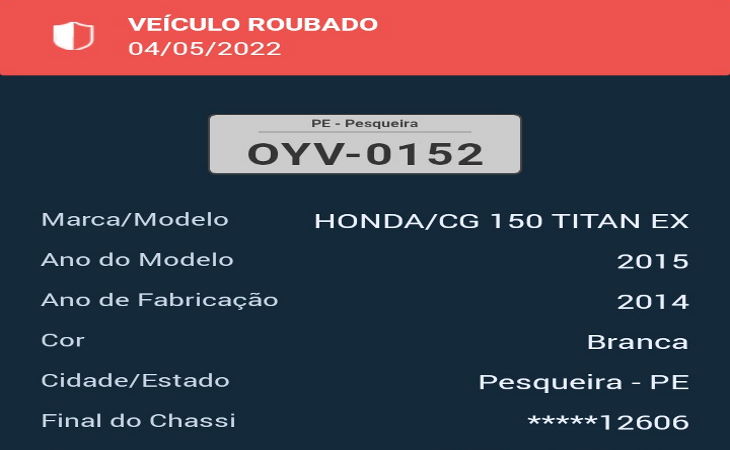 Policiais da ROCAM da 8ª CIPM apreenderam uma moto clonada na tarde desta terça-feira (26), no município de Pesqueira, no Agreste. A motocicleta Yamaha, YBR-125, cor preta, estava com placa de uma outra moto com as mesmas características, o condutor informou que adquiriu a moto em um leilão, ele foi levado para delegacia de Polícia Civil, onde foi autuado em flagrante.