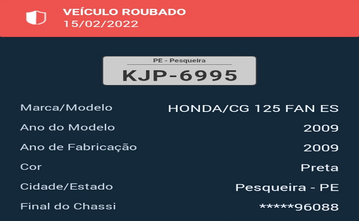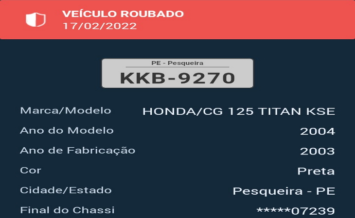 Um marginal portando arma de fogo roubou uma motocicleta numa estrada do Sítio Boa Vista, em Pesqueira, na manhã de sexta-feira, 18. A moto roubada tem placa KLK-5159, cor preta e modelo Fan 125. Segundo o piloto, estava trafegando pela estrada sentido ao município de Alagoinha quando um elemento surgiu de dentro do mato anunciando um assalto e exigindo a moto. Então, ao se apossar dela, empreendeu fuga e desapareceu. A polícia foi informada sobre LER NOTÍCIA