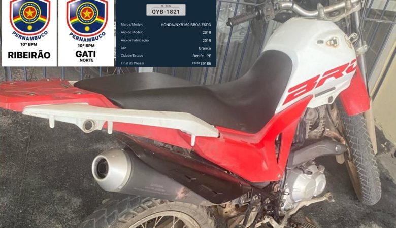 A polícia militar apreendeu uma motocicleta que estava com a numeração do chassi adulterado e havia sido clonada. O veículo foi localizado no início da tarde desta segunda-feira, 19, no distrito de Aripibu, em Ribeirão, na Mata Sul de Pernambuco e constava queixa-crime em relação a placa original, KKO 8I90, modelo NXR 150 Bros. Um homem de 40 anos pilotava o veículo quando foi abordado pelos militares. Conforme a polícia, o policiamento realizava rondas e LER NOTÍCIA