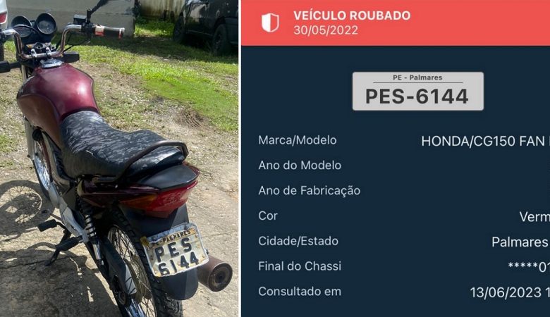 Policiais militares do 10º Batalhão apreenderam uma motocicleta modelo NXR 150 Bros, de cor preta, com placa KHR-8187, que estava registrada como roubada no município de Santa Cruz do Capibaribe/PE. O veículo foi localizado por volta das 17h30 de quarta-feira, dia 10, na Rua da Macaíba, no bairro Beira Rio, em Ribeirão/PE, após abordagem ao condutor, um indivíduo de 22 anos. Segundo informações dos militares, durante rondas na cidade, eles notaram que o veículo apresentava LER NOTÍCIA