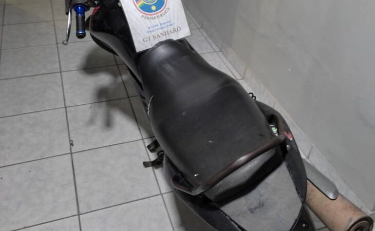 Policiais da 8ª CIPM apreenderam uma motocicleta modelo Titan, 125, vermelha, sem placa, com chassi final 03440, que estava com queixa de roubo, na tarde de terça-feira, 19, numa estrada do Distrito de Mulungu, em Sanharó, durante uma abordagem. Conforme os militares, uma equipe de ROCAM realizava a “Operação Duas Rodas” quando avistaram um indivíduo pilotando uma moto em atitude suspeita, ao ser abordado foi realizada uma consulta veicular, sendo encontrado pela numeração do chassi LER NOTÍCIA