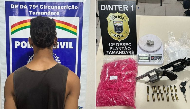 A Polícia Civil de Pernambuco, através da 79ª Delegacia de Tamandaré, prendeu em flagrante David Souza Santos pelos crimes de tráfico de drogas, posse ilegal de arma de fogo e receptação dolosa. A ação policial ocorreu na tarde da última terça-feira (2), no município de Tamandaré, no Litoral Sul de Pernambuco.. Durante a operação, os policiais civis apreenderam com o suspeito: 01 porção de maconha, 01 caderno com anotações do tráfico de drogas, diversos pinos LER NOTÍCIA