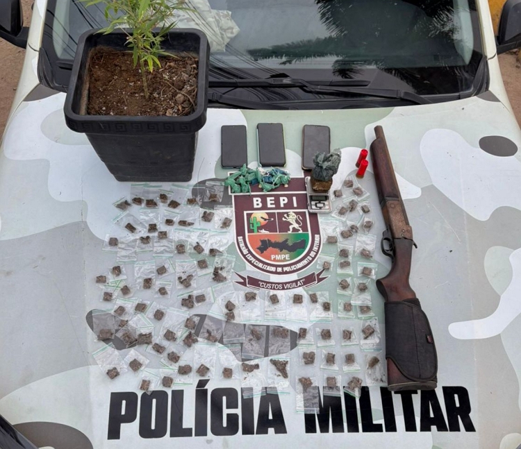 Com os suspeitos, os policiais apreenderam um expressivo material ilícito, reforçando a suspeita de envolvimento com atividades criminosas. Foram recolhidas uma espingarda calibre 12, duas munições do mesmo calibre, 106 bigs de maconha, duas porções da droga totalizando 108 gramas, dois pés de maconha e três aparelhos celulares, que podem auxiliar nas investigações.