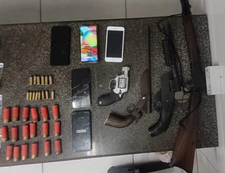 Dois dos envolvidos seriam suspeitos de cometer uma dupla tentativa de homicídio, na noite anterior, no centro da cidade. As guarnições se deslocaram até o endereço citado e lograram êxito nas prisões. Também foram apreendidos um ziplock de cocaína e 3g da mesma droga,100 ziplocks de maconha, uma balança de precisão, cinco celulares, um revólver calibre 38, uma garruncha calibre 38, uma espingarda calibre 12, um rifle calibre 44, 18 munições calibre 12, oito munições calibre 38, seis munições calibre 44.