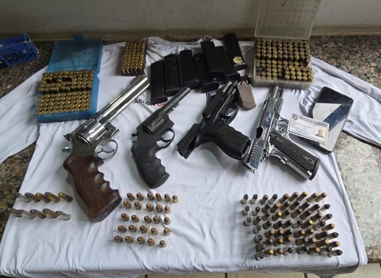 Em uma sacola, o efetivo localizou nada menos que dois revólveres calibre 38, uma pistola 45mm e outra 9mm, seis munições 45mm, 93 munições calibre 38, 26 munições calibre 357 e 26 munições calibre 9mm.