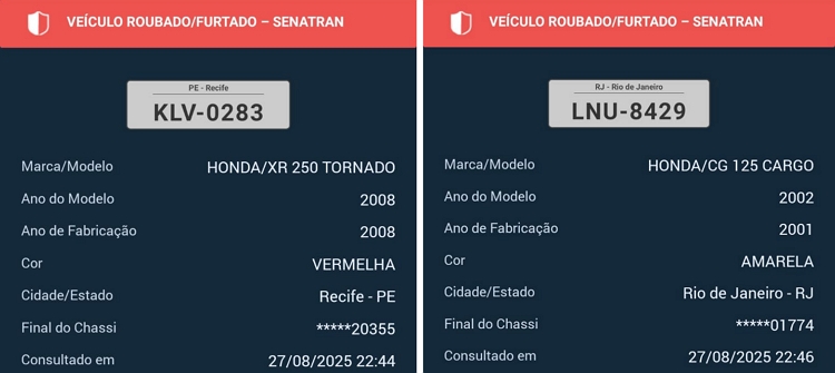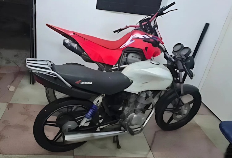Na segunda ocorrência, os policiais localizaram uma CG 125 branca, também sem placa. A vistoria identificou adulteração na numeração do motor, que correspondia a um veículo com queixa de roubo e furto.