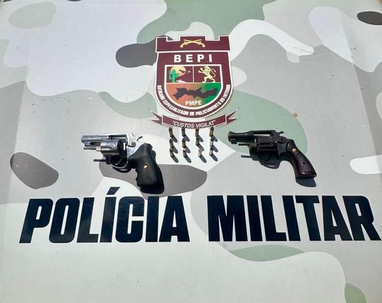 Os suspeitos foram identificados como Eufrásio Cosmo Cavalcanti dos Santos, de 51 anos, e Flávio Cosmo Cavalcanti dos Santos, de 23 anos. Com eles, os policiais apreenderam dois revólveres municiados.
