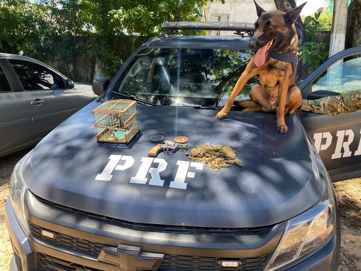 Em Moreno, na BR-232, km 24, a equipe PRF contou com o faro do K-9 Zorro para a apreensão de 100 gramas de maconha que estavam em uma mala no bagageiro de um ônibus da linha Floriano – Recife. Ainda vistoriando o compartimento de carga, os policiais descobriram uma gaiola com quatro pássaros. As bagagens pertenciam a um casal. Com o homem foi encontrado ainda um revólver calibre 22 com numeração raspada e oito munições. A ocorrência foi encaminhada para a Polícia Civil em Prazeres.