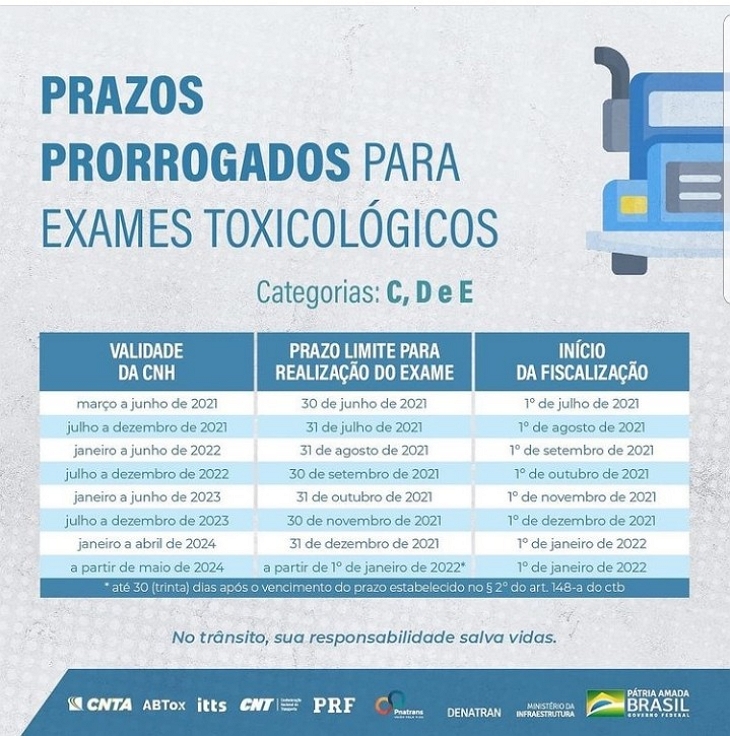 O Conselho Nacional de Trânsito (Contran) prorrogou os prazos para a realização do exame toxicológico periódico para o condutor habilitado nas categorias C, D e E. Publicadas na edição desta quarta-feira, 28, do Diário Oficial da União (DOU), as novas datas foram decididas por conta da pandemia de covid-19, com amplo debate dentro do Fórum Permanente para o Transporte Rodoviário de Cargas (Fórum TRC), com a Associação Brasileira de Toxicologia (ABTOX), Confederação Nacional do Transporte (CNT), Confederação Nacional dos Transportadores Autônomos (CNTA) e a Polícia Rodoviária Federal (PRF).