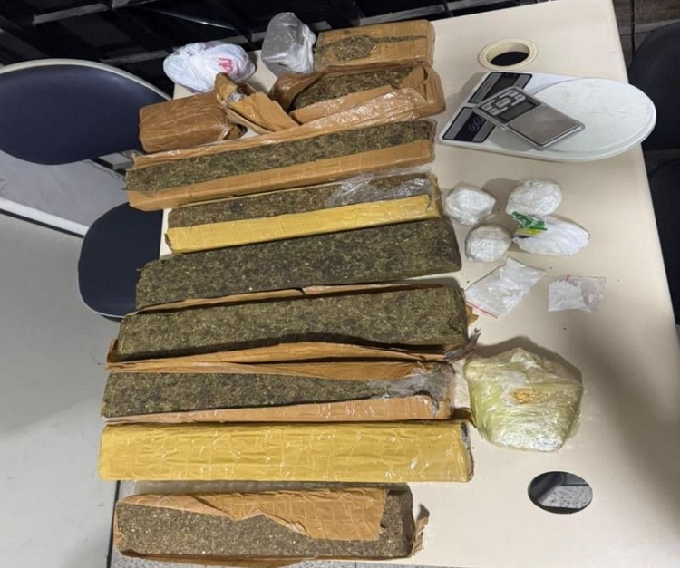 Durante a varredura no local, os policiais encontraram uma arma de fogo artesanal carregada e pronta para uso ao lado da porta. Também foram apreendidos 23 gramas de maconha, uma porção de cocaína, 100 pedras de crack escondidas sob uma cerâmica, além de 16 gramas de crack em porções maiores. No imóvel havia ainda uma espingarda calibre 5.5 e dois aparelhos celulares.