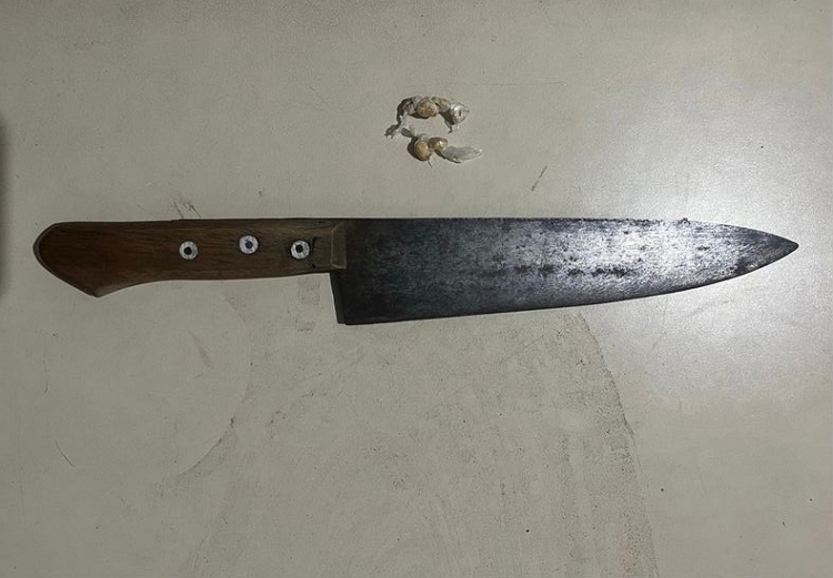 Durante a abordagem, os policiais realizaram busca pessoal nos ocupantes e encontraram uma faca na cintura do motorista. Na vistoria do veículo, foi localizada uma embalagem plástica contendo seis pedras de crack embaixo do banco do motorista.