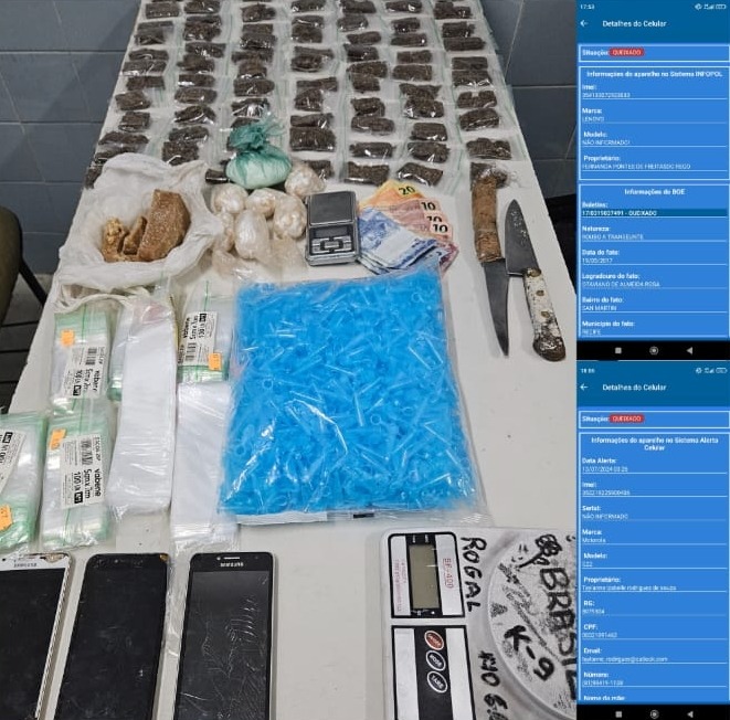 Com base na denúncia, os PMs localizaram e abordaram os suspeitos. Durante a revista, foram encontrados 275 gramas de crack, 70 bigs de maconha e 80 gramas de cocaína, além de uma balança de precisão e duas facas tipo peixeira. Também foram apreendidos dois celulares com queixa de roubo.