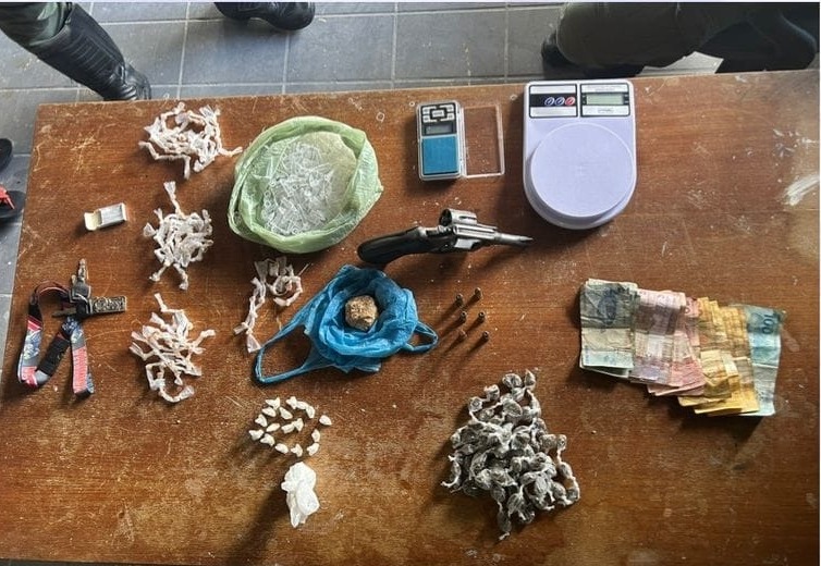 Foi feita a abordagem, e com ele havia uma pedra grande e outras 138 menores de crack, 17 pinos de cocaína, 67 big bigs de maconha, um revólver e seis munições calibre .38, duas balanças de precisão e embalagens para drogas.